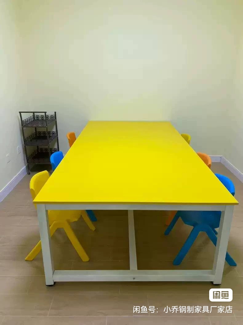 黄色培训桌便宜出,桌面加厚,钢架桌腿结实稳固。桌面尺寸1200*2400×730,适合培训教室、画室使用。桌面成色新,表面光滑平整,钢架无变形。
