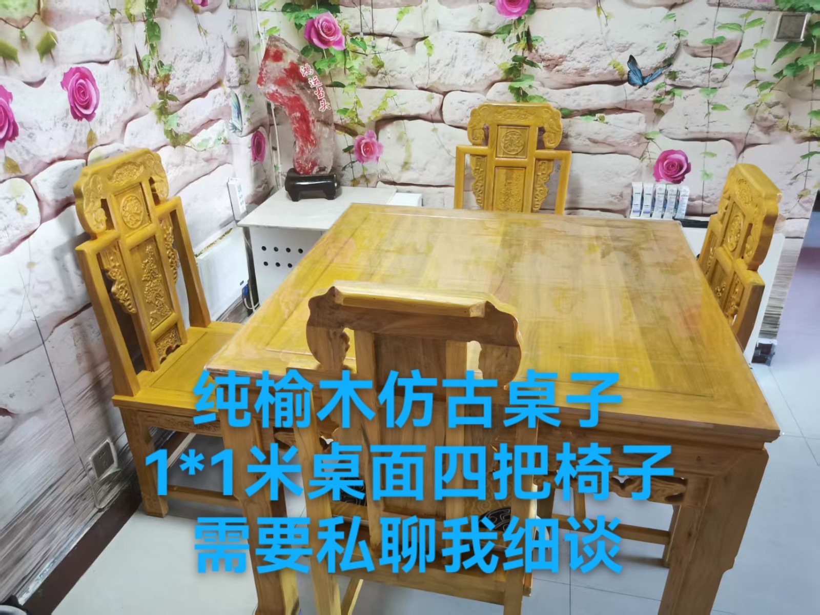 纯榆木,桌面大概1米见方,一套包括一张桌子四把椅子,很沉,需要自提,3800买的1800卖,可以小刀