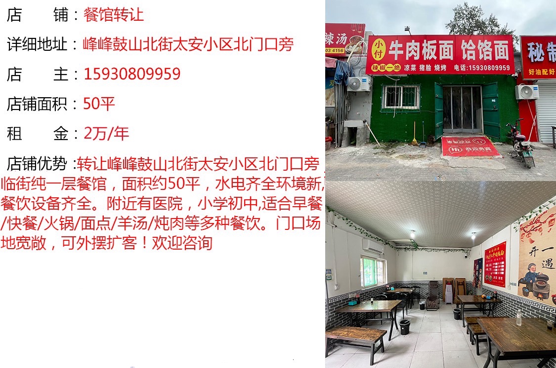 转让峰峰鼓山北街太安小区北门口旁临街纯一层餐馆,面积约50平,水电齐全环境新,餐饮设备齐全。附近有医院,小学初中,适合早餐/快餐/火锅/面点/羊汤/炖肉等多种餐饮。门口场地宽敞,可外摆扩客!欢迎咨询